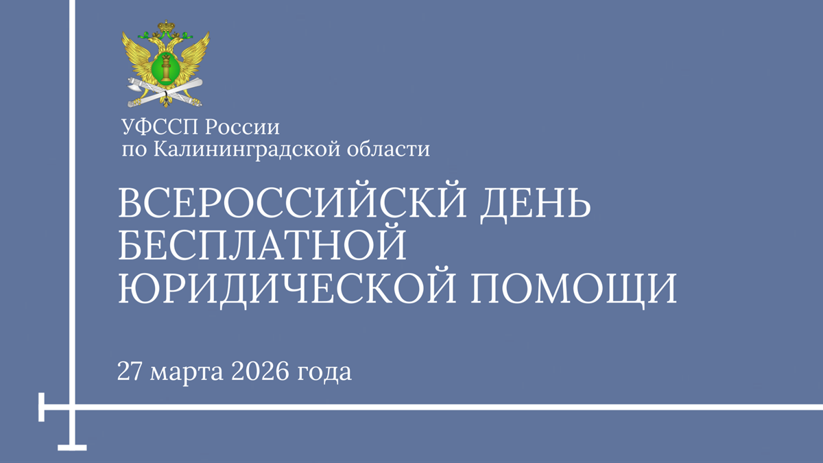 В пятницу, 27 марта, УФССП России по Калининградской области присоединится к Всероссийскому дню бесплатной юридической помощи. Сотрудники правового отдела ведомства будут консультировать граждан по вопросам, входящим в компетенцию службы судебных приставов.